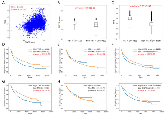 Pan-cancer data analysis. (A) Correlation between CIN70 and TMB (SCC = 0.4536, p-value < 1.0 × 10−293). (B) Association between CIN70 and MSI status (p-value = 3.041 × 10−30, Mann–Whitney U test). (C) Association between TMB and MSI status (p-value = 5.819 × 10−199, Mann–Whitney U test). (D) Association between TMB and progression-free survival (PFS) (p-value = 3.733 × 10−38, log-rank test). (E) Association between MSI status and PFS (p-value = 0.0228, log-rank test). (F) Association between CIN70 and PFS (p-value = 4.869 × 10−26, log-rank test). (G) Association between TMB and overall survival (OS) (p-value = 2.018 × 10−42, log-rank test). (H) Association between MSI status and OS (p-value = 0.0591, log-rank test). (I) Association between CIN70 and OS (p-value = 1.052 × 10−36, log-rank test).