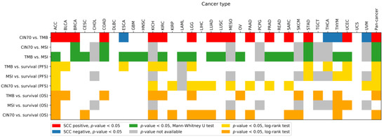 The following are available online at https://www.mdpi.com/2075-1729/10/11/276/s1, Figure S1: Correlation between CIN70 and TMB in 33 cancer types, Figure S2: Association between CIN70 and MSI status in 25 cancer types with MSI-H samples, Figure S3: Association between TMB and MSI status in 25 cancer types with MSI-H samples, Figure S4: Association between TMB and progression-free survival, Figure S5: Association between MSI status and progression-free survival, Figure S6: Association between CIN70 and progression-free survival, Figure S7: Association between TMB and overall survival, Figure S8: Association between MSI status and overall survival, Figure S9: Association between CIN70 and overall survival, Table S1: Association between TMB and OS/PFS, Table S2: Association between MSI and OS/PFS, Table S3: Association between CIN70 and OS/PFS.