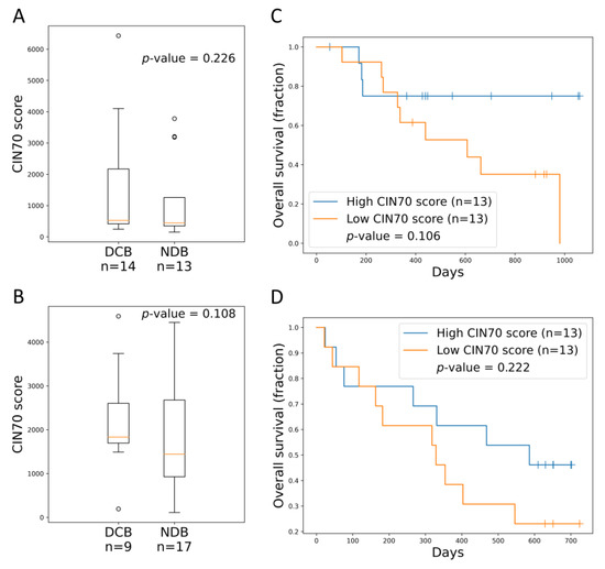 Association between CIN70 and immune checkpoint inhibitor responses. (A) CIN70 among responders and non-responders in the Hugo et al. melanoma cohort (p-value = 0.226, Mann–Whitney U test). (B) CIN70 among responders and non-responders in the Snyder et al. urothelial cancer cohort (p-value = 0.108, Mann-Whitney U test). (C) Survival analysis comparing OS of patients with high/low CIN70 score in the Hugo et al. melanoma cohort (p-value = 0.106, log-rank test). (D) Survival analysis comparing OS of patients with high/low CIN70 score in the Snyder et al. urothelial cancer cohort (p-value = 0.222, log-rank test). DCB: durable clinical benefit, NDB: no durable benefit.