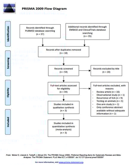 After removing duplications and articles with unrelated topics, a total of 34 studies were reviewed in detail for eligibility; 31 studies were excluded, including 16 articles in review form, 1 observational study, 9 studies with evaluations of secondary intrauterine adhesion, 3 animal studies, 1 study with only one arm, and 1 conference abstract. Figure 1 shows the flowchart for identifying studies that met the criteria for the current meta-analysis. In the end, three randomized controlled studies [,,] were included for meta-analysis.