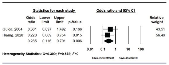 Heterogeneity between studies was evaluated using Cochran’s Q test and measured by I2 statistics. Low, moderate, and high heterogeneity were defined as I2 values of 25%, 50%, and 75%, respectively. A two-sided p-value of ≤0.05 was regarded as statistically significant. Comprehensive Meta-analysis Version 3.0 (Biostat Inc., Englewood, NJ, USA) was used for data synthesis []. A random effect model was used to calculate effect size in meta-analysis due to potential clinical heterogeneity from different surgical indications and investigated populations. Odds ratios (ORs) were calculated for dichotomous outcomes, with 95% CI measuring the effect of applying HA gels in hysteroscopic surgery versus no administration of anti-adhesion products according to the Cochrane Handbook for Systematic Reviews of Interventions Version 6, 2019.