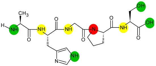 Exchangeable protons in the protein chain. Sites in the protein backbone potentially capable of undergoing H/D exchange are designated with yellow, while additional sites also bearing exchangeable (heteroatom-bound) hydrogens are labeled with green color. Proline possesses no exchangeable hydrogens and thus its backbone amide nitrogen is denoted in red.