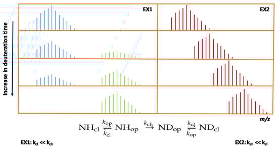 The protein chain may also exist in two extreme folding states [23,55]. The conformation for which the backbone is solvent accessible and the Gibbs free energy is favorable for hydrogen/deuterium exchange is usually referred to as the “open state”, whereas the so-called “closed state” is much less solvent accessible and the exchange process is generally greatly hindered. Throughout the backbone, where the above phenomena may considerably affect the observed H/D exchange rates, the rate constants of the H/D exchange might be higher or lower than those of the conformation changes, giving rise to two apparent mechanisms, referred to as EX2 and EX1, respectively. When the rate of transition to the open state (kop) is much greater than the one of the reverse process (kcl, cl: closed state), the protein generally resides in the open state, while the exchange kinetics are predominantly determined by kch and described by a single envelope of isotopes in the MS signal (EX2 kinetics). In case the protein is principally in the stable closed conformation, the observed kinetics are primarily determined by the relation between kch and kcl. When kcl >> kch, the observed signal is again a single envelope and it is independent of time; the kinetic picture is referred to as EX2. Alternatively, when kcl << kch, the EX1 kinetics give rise to multiple isotopic envelopes in the MS spectra, whose intensity ratios are dependent on the H/D exchange times. An example of these processes is shown in Figure 3. In case of native proteins, the EX2 kinetics are much more common [56,57], but the EX1 kinetics are also observed at times [10,25,55,58,59]. Occasionally, the relevant H/D exchange rate and the respective rate of the studied conformational change are of similar magnitudes; this results in a mixed-type kinetics. Here, the shift from the lower masses is much slower and two distinct envelopes are observed even after prolonged exchange times [58].