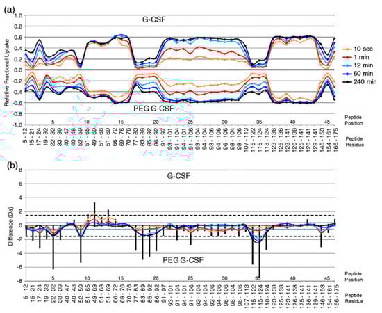 Investigation of the effects of PEGylation on G-CSF. On a representative butterfly chart, forty-six peptides of G-CSF and PEG-G-CSF are compared in terms of (a) relative change in deuterium levels and (b) absolute mass difference. Relative D-uptake is obtained by dividing the deuterium level (in Da) by the total number of backbone amide hydrogens that could have become deuterated. In (b), the blue dotted line is set at 0.5 Da (both positive and negative difference) as the threshold for significant differences. Reprinted with permission from Wei et al. Using hydrogen/deuterium exchange mass spectrometry to study conformational changes in granulocyte colony stimulating factor upon PEGylation. Journal of the American Society for Mass Spectrometry 2012, 23(3), 498–504.