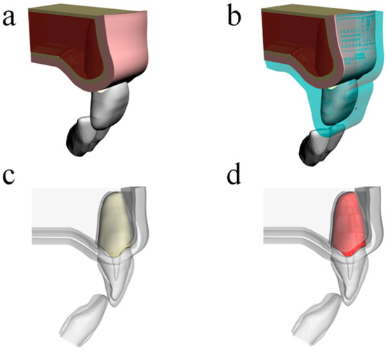 Three-dimensional models simulated in the present study according to: (a) absence of mouthguard, (b) presence of custom-made mouthguard, (c) ankylosed tooth, and (d) healthy periodontal ligament.