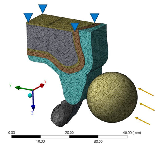 A dynamic impact analysis was performed using a single-step implicit dynamic contact analysis. Boundary conditions defined a rigid impact object (steel sphere) hitting the tooth surface at 1.0 m·s−1 initial velocity in the X direction (Figure 2). The impact object was unrestrained in its path after this initial velocity was applied. No gravitational or air-friction forces were modeled, and recoil of the impact object was determined by its inertia and the impact contact responses. The base surface of the maxillary bone was restricted in X, Y, and Z directions [8]. In this study, the stress distribution was analyzed using the von-Mises Stress criteria. Shock absorption capability was defined as the percentage of the stress peak and compared to that of the model without a mouthguard for healthy and ankylosed PDL.
