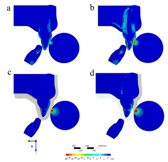 Sagittal view of the Von-Mises stress distribution in the tooth structure after the impact in different situations: (a) Without mouthguard and with healthy PDL, (b) without mouthguard and ankylosed tooth, (c) with mouthguard and with healthy PDL, and (d) with mouthguard and ankylosed tooth.