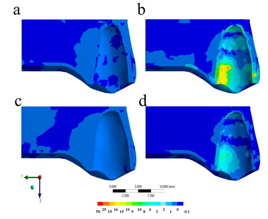 Von-Mises stress distribution in the periodontal dental ligament (PDL) and bone tissue after the impact in different situations: (a) Without mouthguard and with healthy PDL, (b) without mouthguard and ankylosed tooth, (c) with mouthguard and with healthy PDL, and (d) with mouthguard and ankylosed tooth.