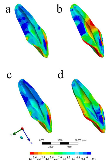 Buccal view of the Von-Mises stress distribution in the tooth structure after the impact in different situations: (a) Without mouthguard and with healthy PDL, (b) without mouthguard and ankylosed tooth, (c) with mouthguard and with healthy PDL, and (d) with mouthguard and ankylosed tooth.