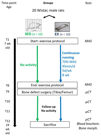 Study design SED: sedentary control, EX: moderate continuous treadmill running exercise, MAS: maximal aerobic speed, µCT: micro-computed tomography, biochem.: biochemistry analysis, morph.: morphometry.