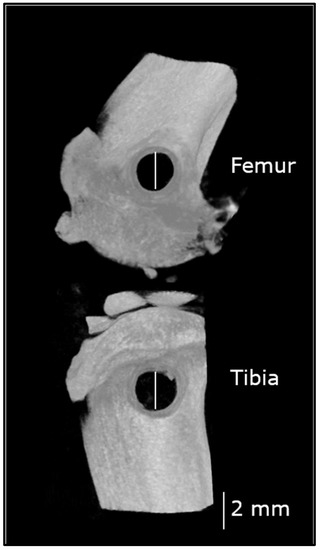 Non critical-sized bone defects in the tibia and the femur immediately after surgery. These microcomputed tomography (µCT) images display the 2 mm bone defects in the distal metaphysis of the femur and the proximal metaphysis of the tibia. This figure is a composite image of reconstructions obtained from the femur and the tibia, separately.
