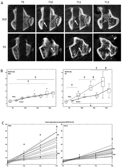 In contrast, significant increases in BV/TV in EX rats were observed between each time-point for the tibias (p < 0.0001), while no significant difference was observed at intermediate time-points for the femurs. Overall, no difference in BV/TV between tibias and femurs was observed in SED rats, regardless of the time-points. In contrast in EX rats, BV/TV was higher in tibias at late time-points (T11 and T12), than respective results obtained in femurs (p = 0.01; Figure 3B).