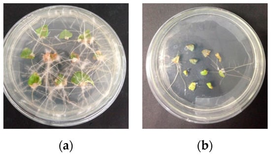 Photographs of the hairy roots of Solanum nigrum L. at 21 d induced with wild-type Agrobacterium rhizogenes ATCC15834 (a) and recombinant Agrobacterium rhizogenes ATCC15834 containing the IRT1 gene (b).