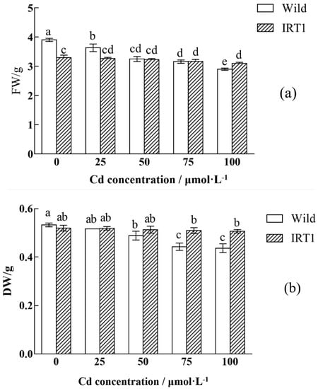 Biomass accumulation of the wild-type and transgenic hairy roots of Solanum nigrum L. growing in MS medium with or without Cd stress. (a) FW: fresh weight; (b) DW: dry weight. Values of biomass accumulation in this figure followed by different letters (i.e., a, b, c, and d) are significantly different at p < 0.05 according to Duncan’s test. The FW and DW were calculated based on biomass accumulation in 50 mL MS medium per flask.