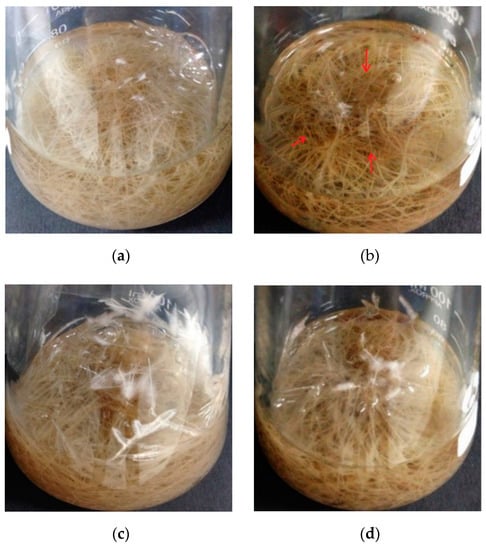 The biomass of the wild-type hairy roots growing in the medium with 50 and 100 μM CdCl2 decreased by 9% and 22%, respectively (Figure 3), indicating significant growth inhibition under Cd stress (p < 0.05). Serious growth inhibition was not observed in the case of the transgenic hairy roots, and there was no big difference (Figure 3b, p < 0.05) between biomass accumulation (DW) during the cultivation without and with Cd stress, even in the presence of 100 μM CdCl2. The accumulated biomass of the transgenic hairy roots after 35 days of cultivation reached 0.507 g, against 0.437 g of that observed in the wild-type control. Wild-type hairy roots in the presence of high Cd stress (100 μM CdCl2) became slightly brown in color (the part with red arrow) (Figure 4b). In the transgenic hairy root cultures, the browning phenomenon under Cd stress was relatively weak (Figure 4d).
