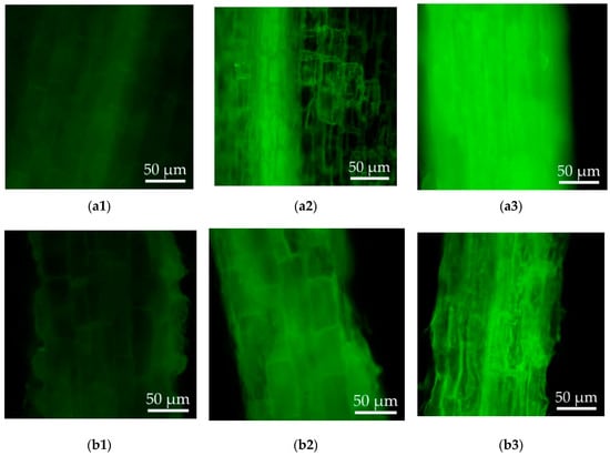 Thereafter, to compare the cellular oxidative stress and cell damage under Cd stress between the wild-type and transgenic hairy roots, the levels of intracellular ROS and cell damage were studied. The DCFH could be oxidized by the intracellular ROS and converted into DCF with green fluorescence. The levels of ROS in the hairy roots can be reflected by observing the intensity of fluorescence. As shown in Figure 5, faint green fluorescence and cell wall structures were observed in both the wild-type and transgenic hairy roots of Solanum nigrum L. growing in the MS medium without CdCl2 (Figure 5a1,b1). Increased ROS levels were induced in the hairy roots under Cd stress. Compared to the wild-type hairy roots, the transgenic lines demonstrated reduced ROS level during middle Cd stress (50 μM CdCl2). In response to high Cd stress (100 μM CdCl2), cell wall boundaries became blurrier and much higher ROS was accumulated in the wild-type hairy roots than the transgenic lines (Figure 5a3,b3).