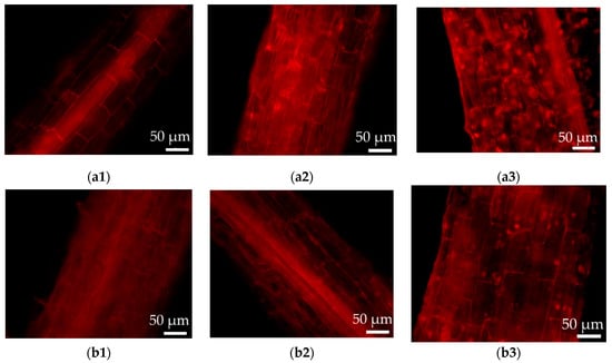 The above results were further proved by the PI staining of the hairy roots (Figure 6), in which cell damage can be recorded by the red fluorescence intensity. As shown in Figure 6, the cell damage was present in both wild-type and transformed hairy roots. Much stronger cell damage was observed in the case of wild-type hairy roots growing in the medium with 100 μM CdCl2 (Figure 6a3), as compared to that without Cd addition (Figure 6a1). The results of the PI staining also revealed less fluorescent spots (i.e., less cell damage) in the transgenic hairy roots (Figure 6b3) under high Cd stress (100 μM CdCl2) relative to the wild-type lines (Figure 6a3).