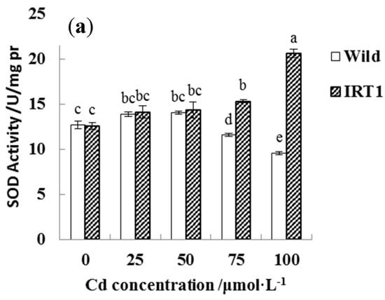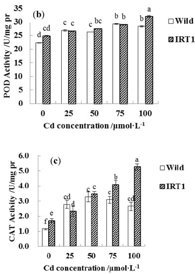 Interestingly, the transgenic hairy roots demonstrated significantly increased SOD, CAT, and POD activities under Cd stress, even in the presence of 100 μM CdCl2. As shown in Figure 7a–c, SOD and CAT activities in the transgenic hairy roots under the highest Cd stress (100 μM CdCl2) increased by nearly 100% than the wild-type lines.