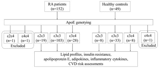 In this pilot study, we aimed to (1) evaluate the significance of apoE genotypes as the risk factors of CVD in RA patients; (2) examine the differences in the plasma lipid profile, plasma adipokines levels, IR, and inflammatory parameters in RA patients with different apoE genotypes; and (3) evaluate the association of plasma adipokines levels with lipid profile, IR, RA inflammatory parameters, and CVD risk in RA patients with different apoE genotypes.
