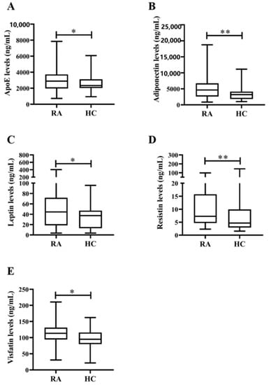 Comparisons of plasma apoE levels and adipokines levels between RA patients and healthy control subjects. Comparisons of plasma levels of (A) apoE, adipokines including (B) adiponectin, (C) leptin, (D) resistin, and (E) visfatin between rheumatoid arthritis (RA) patients and healthy control (HC) subjects. Data are presented as box-plot diagrams, with the box encompassing the 25th percentile (lower bar) to the 75th percentile (upper bar). The horizontal line within the box indicates the median value, respectively, for each group. * p < 0.05, ** p < 0.005, versus HC, determined by Mann–Whitney U test.