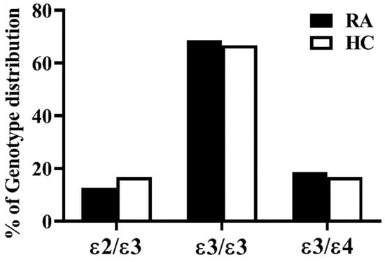 As shown in Figure 3, the distribution of apoE genotypes between RA patients and HC was indistinguishable, with ε3/ε3 the most common apoE genotype. (68.6% in RA patients and 66.6% in HC).