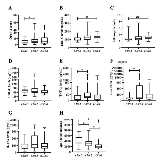 Comparisons of CVD risk, lipid profile, and cytokines in RA patients with different apoE genotypes. Comparisons of (A) CVD risk (Qrisk-2 score), (B) LDL-C levels, (C) atherogenic index, (D) HDL-C levels, (E) TNF-α levels, (F) IL-6 levels, (G) IL-17A levels, and (H) plasma apoE levels among RA patients with different apoE genotypes. Data are presented as box-plot diagrams, with the box encompassing the 25th percentile (lower bar) to the 75th percentile (upper bar). The horizontal line within the box indicates the median value for each group. * p < 0.05, versus patients with apoE ε3ε3 genotype; # p < 0.05, ## p < 0.001, versus patients with apoE ε3ε4 genotype, determined by Mann–Whitney U test.
