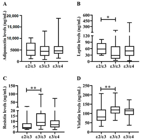 Comparisons of plasma adipokines levels in RA patients with different apoE genotypes. Comparisons of (A) adiponectin, (B) leptin, (C) resistin, and (D) visfatin among RA patients with different apoE genotypes. Data are presented as box-plot diagrams, with the box encompassing the 25th percentile (lower bar) to the 75th percentile (upper bar). The horizontal line within the box indicates the median value for each group. * p < 0.05, ** p < 0.01, versus patients with apoE ε3ε3 genotype, determined by Mann–Whitney U test.