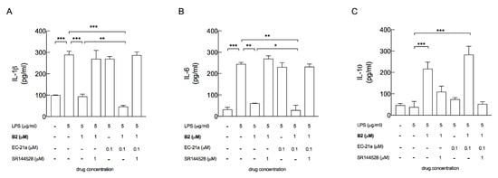 To evaluate the ability of EC-21a to act as PAM of CB2R, we evaluated whether it was able to potentiate the activity of the orthosteric agonist B2 on CB2R. With this purpose, we stimulated the BV2 cell line with LPS to induce a pro-inflammatory response that mimicked the status of microglial inflammation. The activated BV2 cells were treated with B2 and EC-21a either alone or in combination. Furthermore, a simultaneous treatment was also performed in the presence of the CB2R antagonist SR144528. As a marker of inflammatory response, we analyzed the release of extracellular interleukins in cell media of stimulated BV-2 cells in all tested conditions.