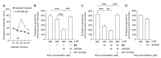 Notably, the release of neurotransmitters can be measured from synaptosomes in superfusion, allowing the pharmacological characterization of compounds directly acting at the presynaptic release-regulating receptor target [,,,]. The release of glutamate was measured from hippocampal synaptosomes in superfusion []. During superfusion, 3-min samples (from b1 to b5) were collected starting from t = 33 min until the end of the experiment. At t = 38 min the synaptosomes were superfused with standard medium added with the depolarizing compound 4-aminopyridine (4-AP, 600 μM). To evoke the release of glutamate, we added in the superfusion medium the depolarizing compound 4-AP, a selective blocker of voltage-activated K+ channel which has been repeatedly reported to be able to increase the exocytotic release of glutamate from synaptosomes, in a way sensitive to modulation by presynaptic release-modulatory receptors [,,]. The CB1R agonist (B2 1 μM), CB1R antagonist (SR 141416A, 1 μM) and CB1 allosteric compound (GAT229 1 μM or 10 μM) were added (in respective tests) 8 min before the depolarizing stimulus and maintained in the presence of 4-AP. The CB1R agonist or antagonist or allosteric compound had no effects on the basal release of glutamate. As a control, in each superfusion experiment, at least 2 chambers were superfused only with the standard medium. The glutamate released in the collected samples was measured by HPLC analysis (Waters Alliance, Milford, MA, USA) involving automatic pre-column derivatization with o-phthalaldehyde, separation on a C18 reverse phase chromatography column (Chrompack International, Middleburg, The Netherlands) and fluorimetric detection. Homoserine was used as the internal standard; the detection limit was 100 fmol/μL. [,]. In Figure 2A a representative time course of endogenous glutamate released in the collected samples in a representative experiment is shown. The amounts of endogenous glutamate present in the collected samples were expressed as pmol/mg protein.