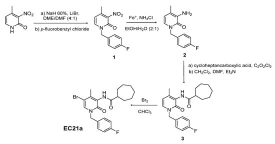 Synthesis of N-[5-bromo-1,2-dihydro-1-(4′-fluorobenzyl)-4-methyl-2-oxo-pyridin-3yl] cycloheptanecarboxamide (EC21a).