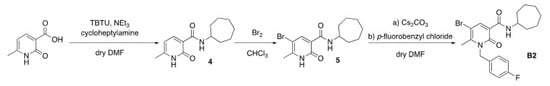 Compound B2 was prepared following the synthesis reported in Scheme 2. The commercially available 2-hydroxy-6-methyl-nicotinic acid was treated with the coupling agent 2-[(1H-benzotriazole-1-yl)-1,1,3,3-tetramethyluronium tetrafluoroborate] (TBTU) in the presence of triethylamine at 0 °C for 30 min. After that, the cycloheptylamine was added and the reaction mixture was stirred at 0 °C for 30 min and then at room temperature for 12 h to give the carboxamide derivative 4. The treatment of intermediate 4 with a solution of bromine in chloroform afforded the corresponding bromo-derivative 5, which was N-alkylated by treating with cesium carbonate in anhydrous DMF at room temperature for 1 h, and then with p-fluorobenzyl chloride, to give the desired compound B2 [].
