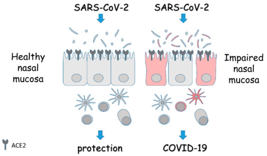 Schematic overview of the role of the nasal mucosa in COVID-19. The panel depicts the epithelial lining of the nasal mucosa expressing the entry receptors for SARS-CoV-2, and the associated microbiota and immune cells. In the presence of a healthy mucosa, the response to the virus is protective. On the contrary, in the presence of an impaired mucosa, the homeostasis is lost and alterations in microbiota, barrier integrity, and immune response turn the viral infection into overt disease. Details are described in the text.