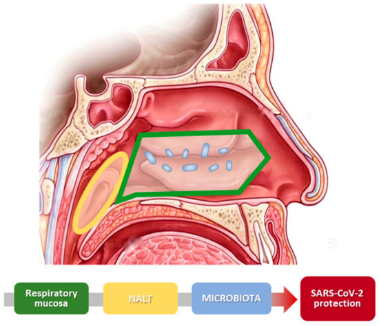 While alterations of the gut microbiota [15,16] and the lower respiratory tract [17] have been reported in COVID-19 patients, with potential diagnostic and therapeutic implications [18,19,20,21], the relationship between COVID-19 and the nasal microbiota has received little attention. Based on a previous hypothesis that emphasized the importance of the nasal barrier to fight COVID-19 [22], in this review we aim to discuss how immunomodulation could stimulate the local nasal immune response and empower the nasal microbiota to prevent SARS-CoV-2 penetration and virulence.