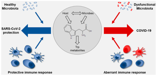 The potential role of the IDO1-AhR pathway is however disputed. A possible aberrant activation of AhR and IDO1 has been put forward to explain the symptomatology of COVID-19 patients [68], and a recent study identified AhR signaling as a common host response to infection by coronaviruses responsible for lung pathogenesis [69]. These results would suggest that inhibiting AhR activity could be therapeutically exploited in COVID-19. However, AhR is a promiscuous receptor that can bind multiple ligands with both positive and negative effects on inflammation, immunity, and infections [66]. In particular, microbial ligands working as AhR agonists may play a beneficial activity in the regulation of mucosal homeostasis, for instance by promoting epithelial barrier integrity [70,71,72], thus increasing the resistance to infection, and, in turn, AhR may regulate the composition of the microbiome [73]. Therefore, it remains to be seen whether AhR antagonism or agonism would be the most promising therapeutic strategy in COVID-19. Whatever the case, it is important to consider the Trp metabolism as a whole, thus including the host and microbial metabolic pathways, as alterations of the Trp flux may result in pathological conditions [60,74]. The balance between the IDO1 and AhR pathways represents a surrogate for the status of the microbiota and the local immune system and a predictive factor for the susceptibility to infection and the disease course. Therefore, the characterization of Trp metabolism in the nasal mucosa would provide information on the host–microbiota cross-talk and open a new avenue for intervention to maintain a balance between immune tolerance and colonization resistance.