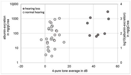 Correlation between hearing ability and albuminuria in eight patients with hearing loss (marked black) and 26 patients with normal hearing ability (n = 36).