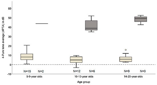 In 38 children (30 patients with normal hearing and eight patients with hearing loss), one or several audiograms were available. The audiograms were divided into three age groups, 5 to 9, 10 to 13 and 14 to 20 years (Figure 2). 30 patients had one audiogram, seven patients had an additional follow-up audiogram and one patient with hearing loss had an audiogram in each age group (three audiograms). The average time between examinations was 40 months. Accordingly, including nine follow-up audiograms, a total of 47 audiograms were analyzed. The mean 4PTA of the 5–9 years old children was 8.9 dB (n = 15) for patients with normal hearing and 43.8 dB (n = 2) with impaired hearing. For the 10–13 years old children, the mean 4PTA was 4.8 dB for children with normal hearing (n = 12) and 41.4 dB for children with impaired hearing (n = 6). For the 14–20 year old children, the mean 4PTA was 7.0 dB (normal hearing; n = 9) and 48.2 dB (hearing impaired, n = 3). Respectively among the 5–9-year olds, the proportion of hearing loss was lower (12%) compared to the 10–13- and 14–20-year olds (33% and 25%). The mean 4PTA of 14–20 year old children was higher in comparison to the 10–3 year old children. The follow-up of five hearing impaired children showed an annual progression of hearing loss between 0.3 dB up to 9.7 dB.