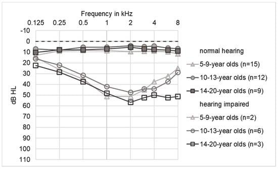 The average tone audiograms of children with hearing loss showed a typical broad mid-cochlear dip with a maximum at 1–3 kHz (trough-type). The curve of the 5–9 year old patients has a maximum dip at 1–2 kHz. In the 10–13 year old patients, the dip spread to 1–4 kHz. In the oldest group of the 14–20 year old patients, there was additional high-frequency hearing loss at 6 and 8 kHz (plateau-type). The maximum hearing loss did not exceed 60 dB.