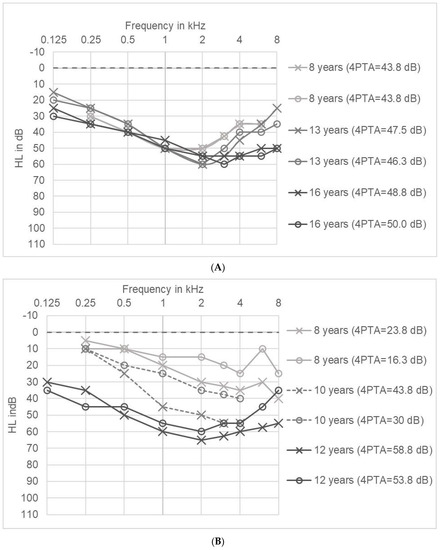 In two patients we were able to analyze the course of hearing impairment over a time-span of 8 years and 4 years: Hearing loss of patient A was found before AS was diagnosed when he was eight years old and was treated with hearing aids. The first audiogram showed a symmetrical broad trough-type with a maximum at 1–2 kHz (Figure 4A). The medical history of the patient indicated regular language development in early childhood, suggesting normal hearing function. Consistent with an impairment of active cochlear amplification, Transient Evoked Otoacoustic Emissions (TEOAE) were not detectable on both sides. Over the years the maximum hearing loss increased in the high frequencies. The 4PTA changed from a minimum of 43.8 dB to a maximum of 50 dB. Overall, hearing loss hardly changed between the ages of 8 and 16 in the frequencies of 0.25 to 2 kHz, but increased to 12.5 dB at 3 kHz, to 20 dB at 4 kHz, 15 dB at 6 kHz and 25 dB at 8 kHz.