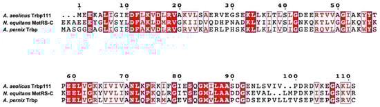 A. aeolicus Trbp111-like structures are frequently found aaRSs and a broad range of protein types across different organisms [1,5,6,7,8]. Multiple alignments of A. pernix Trbp with A. aeolicus Trbp111 and N. equitans MetRS-C (Figure 1) indicate that these three proteins likely possess similar tertiary structures. Accordingly, we previously solved the structure of N. equitans MetRS-C and found that it was similar to A. aeolicus Trbp111, both of which have an OB-fold [11], one of the most evolutionarily ancestral folds inferred from the phylogenomic analysis of protein architecture [23].