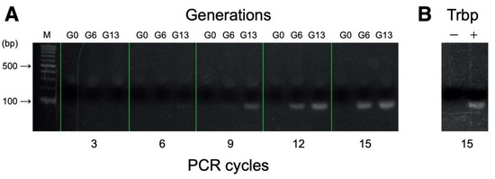 (A) The number of PCR cycles needed to detect the amplified DNA from A. pernix Trbp aptamer-dependent reverse transcribed DNA between generations (G0, G6, and G13). (B) Amplified DNA detection after 15 PCR cycles in the absence (−) and presence (+) of A. pernix Trbp.