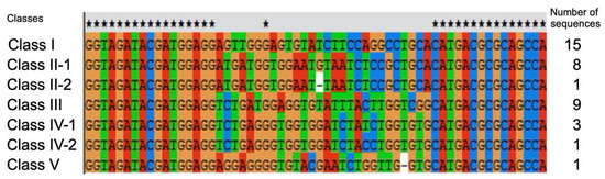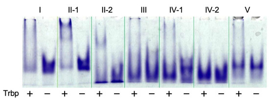 Sequencing results following 13 rounds of A. pernix Trbp-binding selection are shown in Figure 3. Among 38 individual sequences, many were found multiple times, and were categorized as Class I–V. We also identified three unique sequences that were classified as individual classes. The aptamers derived from the representative sequence of each class were then verified for Trbp-binding ability (Figure 4). In the absence of A. pernix Trbp, the position of the bands of Class I, Class II-1, and Class V differed from that of other classes, suggesting dimer formation among these aptamers.