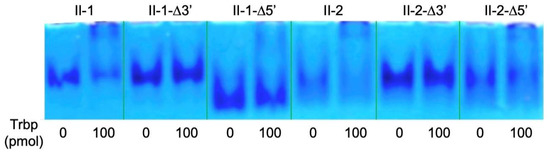 Based on the secondary structures, we prepared deletion mutants of the single-stranded 5′- or 3′-regions (Figure 5B). Class II-1-Δ5′ and Class II-2-Δ5′ mutants, both of which are deficient for the 12-nucleotide region at the 5′-end, were bound to A. pernix Trbp (Figure 6); however, Class II-1-Δ3′ and Class II-2-Δ3′ mutants lacking 2-nucleotide at the 3′-end failed to bind to A. pernix Trbp (Figure 6). This suggests that the 3′-terminal CA nucleotides are important for binding to A. pernix Trbp. Next, we focused on the secondary structures of Class II-1-Δ5′ and Class II-2-Δ5′. The last 21 nucleotides common to both Class II-1-Δ5′ and Class II-2-Δ5′ were isolated (Figure 7). The resulting RNA molecule (Class II-3′-21nt) was able to bind to A. pernix Trbp (Figure 7).