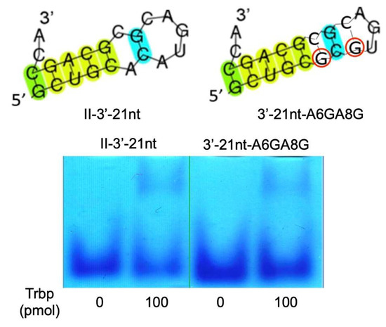 To identify the Trbp-binding region of Class II-3′-21nt, further mutations were prepared. Class II-3′-21nt-A6GA8G is a mutant of Class II-3′-21nt in which both A6 and A8 nucleotides were replaced with G nucleotides. These point mutations are expected to close the Class II-3′-21nt loop (Figure 7). However, mutations at this loop did not affect the binding to A. pernix Trbp (Figure 7).