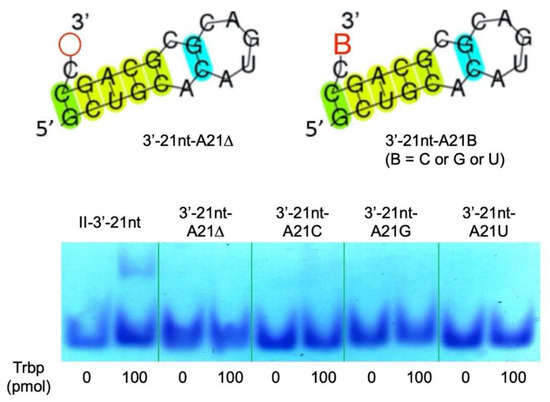 Next, we focused on the 3′-terminal CA nucleotides of Class II-3′-21nt and prepared deletion and substitution mutants of the 3′-terminal A nucleotide (A21), resulting in Class II-3′-21nt-A21Δ, Class II-3′-21nt-A21C, Class II-3′-21nt-A21G, and Class II-3′-21nt-A21U mutant RNA molecules (Figure 8). Deletion or substitution of the 3′-terminal A inhibited binding to A. pernix Trbp, although Class II-3′-21nt-A21C still yielded a very faint band (Figure 8). These results suggest that the 3′-terminal A is important for binding to A. pernix Trbp.