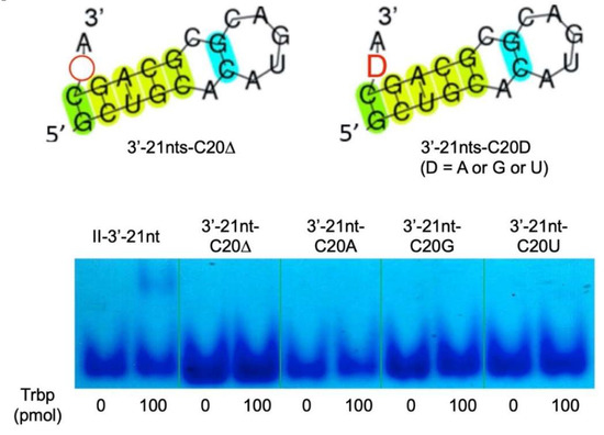 We also prepared deletion and substitution mutants of the C20 nucleotide of Class II-3′-21nt, resulting in Class II-3′-21nt-C20Δ, Class II-3′-21nt-C20A, Class II-3′-21nt-C20G, and Class II-3′-21nt-C20U mutant RNA molecules (Figure 9). A. pernix Trbp did not bind any of these mutants (Figure 9), suggesting that the CA nucleotides at the 3′-end are both important for binding to A. pernix Trbp.