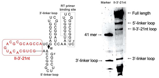 The computational prediction of the secondary structure of Class II-3′-21nt shown in Figure 7 may not reflect tertiary structures. To clarify the structure, we performed SHAPE analysis (Figure 10). SHAPE is used for probing RNA secondary structures. Nucleophilic reactivity of 2′-hydroxyl groups in flexible regions is enhanced toward electrophiles, such as NMIA. At the modified sites, primer extension reaction halts, and the resulting fragments are detected by electrophoretic separation [20]. As shown in Figure 10, bands corresponding to the 3′-linker loop, Class II-3′-21nt loop, 5′-linker loop, and full-length (78-mer) molecules were confirmed. The expected structure of Class II-3′-21nt is relatively simple, and the SHAPE signals derived between the bands detected for the 5′-linker loop and the 41-mer marker support the computational prediction of the secondary structure of Class II-3′-21nt.