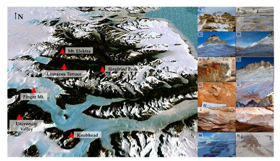 Map of the McMurdo Dry Valleys (Southern Victoria Land), by Google Earth. (A,B) Siegfried Peak north and south, respectively; (C,D) Knobhead north and south, respectively; (E,F). Sample collected at Linnaeus Terrace north and sampling site in south sun-exposure, respectively; (G,H) Samples collected at University Valley north and south, respectively; (I,L) Samples collected at Finger Mt. north and south, respectively; (M) Mt. Elektra north; (N) View of Mt. Elektra peak (southern surface has not been sampled).