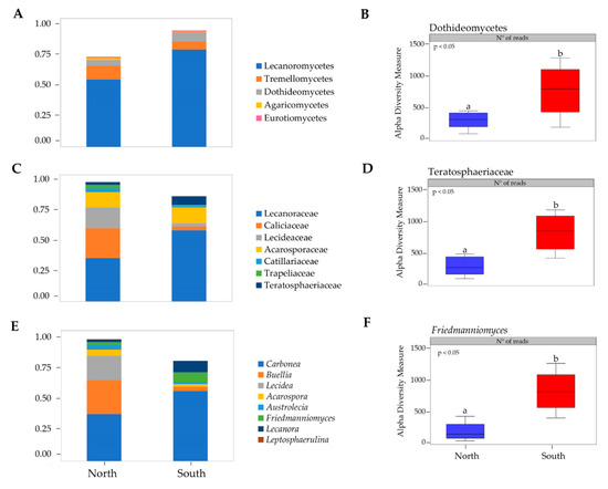 Twenty-five families were identified across all sites (Table S1); Caliciaceae, Acarosporaceae, Lecideaceae, Lecanoraceae, and Teratosphaeriaceae were predominant (Figure 2C). Teratosphaeriaceae was the only fungal family with significantly higher relative abundance in the southern exposed samples (p < 0.05) (Figure 2D).
