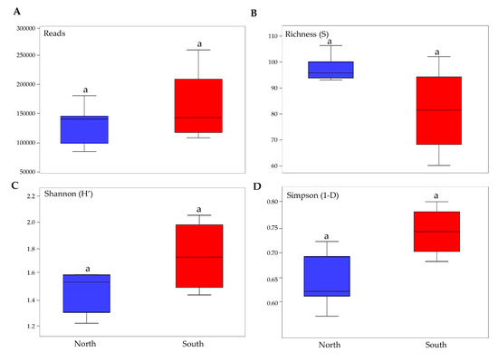 Boxplots show biodiversity measures in north and south sun-exposed cryptoendolithic communities. (A) Number of reads, (B) richness, (C) Shannon’s index, (D) Simpson’s index. Boxplots show 25th and 75th percentile, while error bars show 1st and 99th percentile. Letters indicate no significant differences in one-way ANOVA Tukey test (significant for p < 0.05).