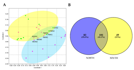 (A) Non-metric multidimensional scaling (NMDS) ordination plots for fungal cryptoendolithic communities differently sun-exposed, based on square-root transformed abundance data (PERMANOVA, p < 0.05). Stress value is 0.07. Since both approaches produced similar results, we showed results based on abundance only. MtEN1, MtEN2, MtEN3 = Mt. Elektra north sample 1, 2, and 3, respectively; FMtN1 and FMtN2 = Finger Mt. north sample 1 and 2, respectively; FMtS1 and FMtS2 = Finger Mt. south sample 1 and 2, respectively; UVS2 = University Valley south sample 2. (B) Venn diagram shows the distribution of fungal OTUs between north and south exposition. Both the percentages of OTUs that were shared and found exclusively in each sun exposure are indicated.